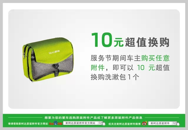 2014斯柯達(dá)服務(wù)節(jié)正在火熱進(jìn)行中!4月20日至5月5日活動(dòng)期間,在斯柯達(dá)原裝附件在線商城購買任意附件,只需10元即可超值換購洗漱包一個(gè)。